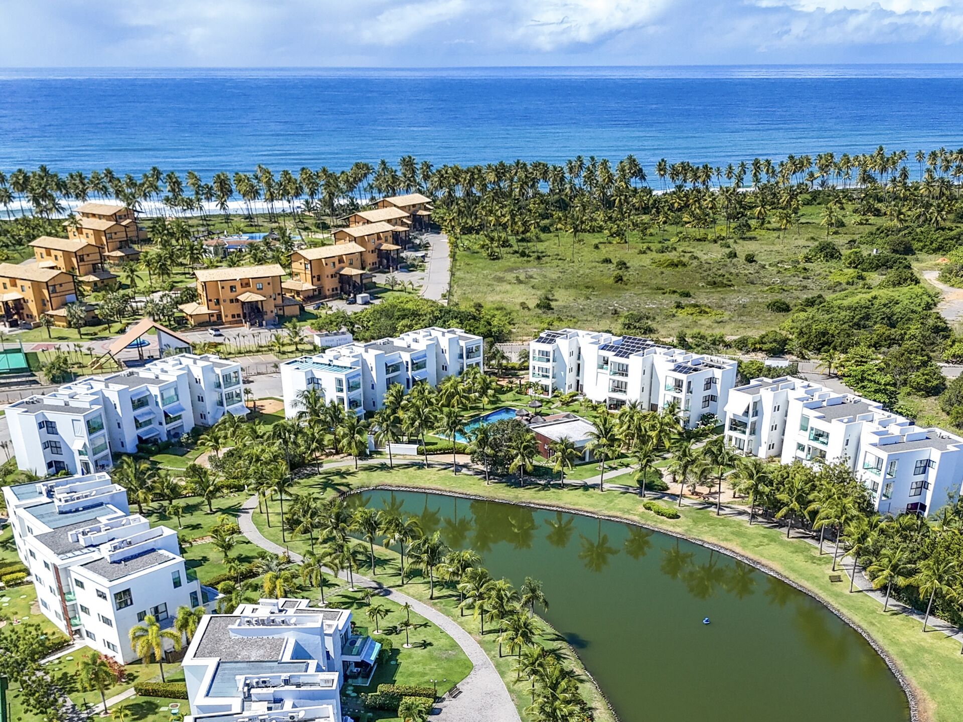 Área de lazer completa: Campo de golf, academia de ginástica, quadra de squash, quadra gramada, quadra poliesportiva, parque infantil, segurança 24h, quartos vista mar, piscina comum, churrasqueira comum, máquina de gelo comum,